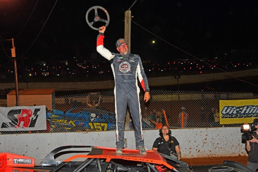Chris Ferguson led all 10 laps from the pole in winning the night’s first heat race by 1.466 seconds over second-starting Michael Leach, who trailed Ferguson the entire way. … Second-starting Garrett Smith fired off from the outside front row and led all 10 laps to win the second heat by 1.345 seconds over Devin Moran. The pole-starting Moran slipped back by Dale McDowell on a lap-five restart, allowing Zack Mitchell to follow Moran by McDowell for third, relegating McDowell to finish fourth. The night’s lone caution flew on the fifth lap for debris after Eli Johnson made contact with the turn-four retaining wall; Johnson continued to finish sixth missing a part of his right-rear quarter panel and rear spoiler. … Jonathan Davenport dominated the third heat race, leading the entire distance and winning by 2.533 seconds over second-starting Chris Madden, who overcame earlier wall contact in time trials to finish second. … Polesitter Ricky Thornton Jr. cruised to win the fourth and final heat race, taking the checkers 2.998 seconds ahead of Mike Marlar, who overcame a three-wide battle on the opening lap and trailed Thornton all 10 laps.