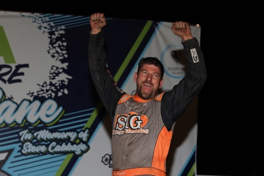 Tad Pospisil in victory lane at Adams County Speedway.
