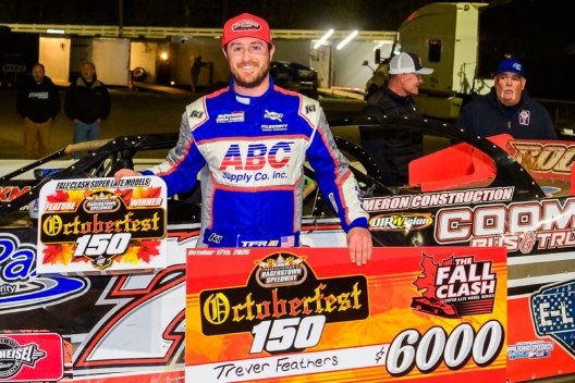 Key notes: Feathers notched his fourth overall feature win of the season, adding to a local Super Late Model victory July 3 at Potomac Speedway in Budds Creek, Md., worth $4,515. ... His other two Fall Clash wins came Sept. 7 at Action Track USA in Kutztown, Pa., and Sept. 20 at Clinton County Speedway in Mill Hall, Pa. ... Points leader Mason Zeigler led the opening 26 laps before giving way to Feathers and fading back at the checkers. ... Polesitter Rick Eckert settled for third. ... Kyle Hardy held third in the early going before giving way to Feathers (lap 16), Gregg Satterlee (lap 20) and Ross Robinson (lap 21), finishing sixth. ... J.T. Spence climbed five spots to place eighth. ... Dylan Yoder pulled off under green on the 26th lap and was credited with 21st. ... The Octoberfest feature lasted 12 minutes with 14 starters completing 35 laps.