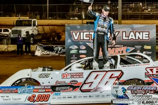 What won the race: Tanner English of Benton, Ky., commanded all 40 laps from the pole in winning Saturday's $6,000 Winterfest feature at Duck River Raceway Park. English crossed the line 0.688 of a second ahead of Dillard Hatchett for his second career Ultimate Heart of America Series victory and first on the Ultimate Southeast tour in the co-sanctioned event.