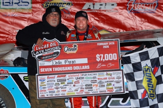 Diving under race-long leader Brandon Sheppard in turn one on the 14th lap, Devin Moran of Dresden, Ohio, led the rest of Tuesday's caution-free 30-lapper for a $7,000 Wieland Winternationals victory on the Lucas Oil Late Model Dirt Series. Moran took advantage of Sheppard's higher corner entry and took the checkers 1.225 seconds ahead of the polesitter for his fourth career Ocala victory.